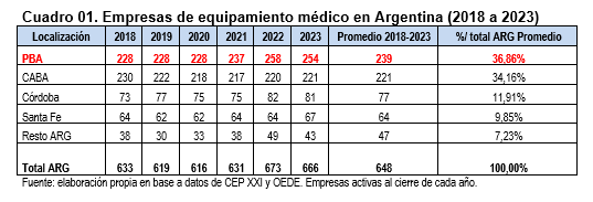El sector argentino de equipamiento médico, que abarca en promedio unas 648 empresas a nivel nacional (período 2018 a 2023), exhibe una marcada concentración geográfica Como evidencia el cuadro 01, las provincias de Buenos Aires (PBA), la Ciudad Autónoma (CABA), Córdoba y Santa Fe son los epicentros de esta industria. En conjunto, estas cuatro jurisdicciones representaron más del 92% de las empresas productoras, una tendencia que se mantuvo consistente en el período indicado. De hecho, PBA y CABA solas promediaron más del 70% del total nacional (36.86% y 34.16% respectivamente). La evolución en estas regiones ha sido bastante estable, con un ligero repunte en PBA y una pequeña fluctuación en CABA, mientras que Córdoba y Santa Fe conservaron una participación constante. Esta centralización productiva se explica directamente por la elevada demanda de servicios médicos en los grandes centros urbanos de estas provincias y por el nutrido entramado de instituciones de salud, del ámbito público y privado, que operan en estos territorios.
