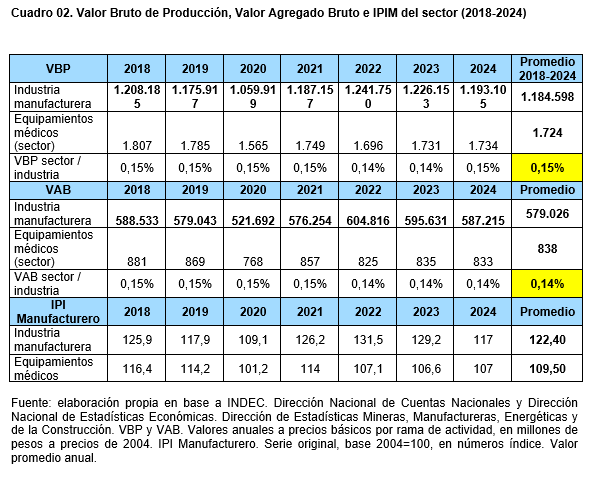En cuanto a las estadísticas de producción, si bien el sector resulta estratégico por su potencial en innovación y soberanía sanitaria, mantiene un perfil de producción bastante modesto en comparación con la industria manufacturera total. Al analizar el Valor Bruto de Producción (VBP), el Valor Agregado Bruto (VAB) y el Índice de Producción Industrial (IPI), se observa que la participación del sector en el total de la industria manufacturera ha sido consistentemente baja, rondando el 0.14%-0.15% durante el período 2018-2024 (Cuadro 02).
