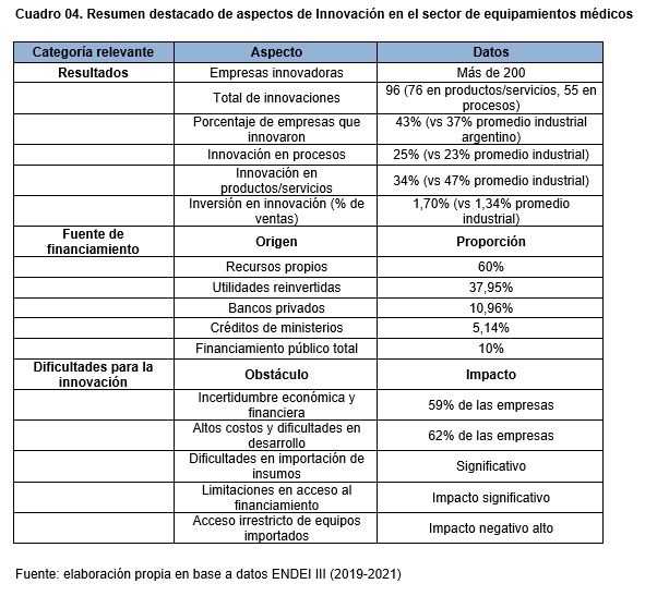 La innovación en el sector de equipamiento médico nacional enfrenta desafíos significativos como los altos costos de I+D, la incertidumbre económica y la falta de un marco normativo específico para tecnologías novedosas, junto con los rigurosos requerimientos en materia de seguridad y calidad. En dicho marco, a nivel general de los resultados logrados en materia de innovación, según la ENDEI III (2019-2021), más de 200 empresas argentinas innovadoras en el sector de equipamiento médico mostraron resultados positivos, implementando 96 innovaciones (76 en productos/servicios y 55 en procesos). El 43% de estas empresas innovó, superando el promedio industrial argentino (37%), especialmente en innovaciones de proceso (25% vs 23%). Sin embargo, la innovación en productos/servicios (34%) fue menor que el promedio de la industria (47%), señalando un área de mejora. Estas empresas invirtieron un promedio del 1,70% de sus ventas en innovación (I+D, ingeniería y otras actividades), cifra superior al promedio industrial (1,34%), lo que destaca la importancia de combinar el conocimiento interno con los avances globales mediante personal calificado.