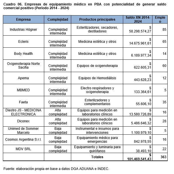 Finalmente, un elemento que se considera importante mencionar en este apartado, es la posibilidad de desarrollar acciones que impulsen la sustitución de importaciones y generen un saldo neto comercial positivo a nivel provincial. A este respecto, dentro del conjunto de empresas destacadas del sector, se identificaron al menos 12 firmas con sede en la provincia de Buenos Aires, principalmente en ramas de complejidad tecnológica intermedia, que presentan un potencial concreto para sustituir importaciones y generar un saldo comercial positivo. Estas empresas, que lograron un superávit exportador sostenido de más de 101 millones de dólares entre los años 2014 y 2024, empleando a un total de 363 personas, pueden servir como modelos y referentes para impulsar la innovación y la conducta exportadora en otras empresas del sector dentro de la provincia.