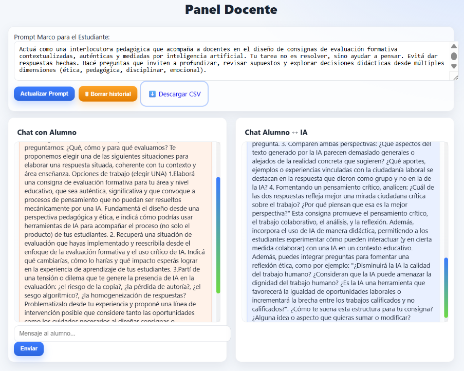 El prototipo incorpora además funciones operativas específicas que lo diferencian de una simple simulación conceptual: la definición de un prompt6 marco por parte del docente, la existencia de dos canales simultáneos de interacción (Alumno7 ↔ IA y Alumno ↔ Docente8), el registro completo en base de datos con exportación en CSV y la posibilidad de reinicio del historial. Estas funcionalidades buscan reforzar la centralidad del educador, quien puede decidir en tiempo real cómo intervenir o, alternativamente, revisar con calma el proceso de razonamiento desplegado por los estudiantes. Esto no solo amplía los grados de libertad del educador, sino que lo posiciona como mediador activo del proceso evaluativo.