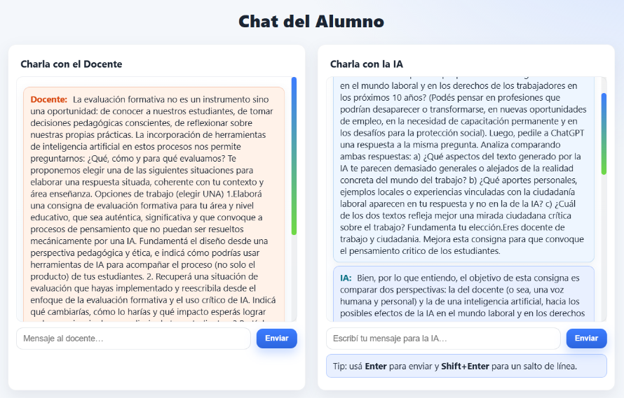 El entorno cuenta con dos interfaces principales. La del estudiante ofrece dos espacios de interacción paralelos: uno para el diálogo con el docente y otro para el intercambio con la IA. El estudiante puede alternar entre ambos sin perder continuidad, y las respuestas de la IA se generan mediante la API de OpenAI (modelo gpt-4o-mini). En la interfaz docente, el profesor observa en tiempo real las conversaciones entre los estudiantes y la IA, interviene directamente en los intercambios, y dispone de controles para pausar, limpiar o exportar los historiales de chat. Esta doble visualización permite un seguimiento simultáneo del proceso de aprendizaje y de las mediaciones que lo configuran.