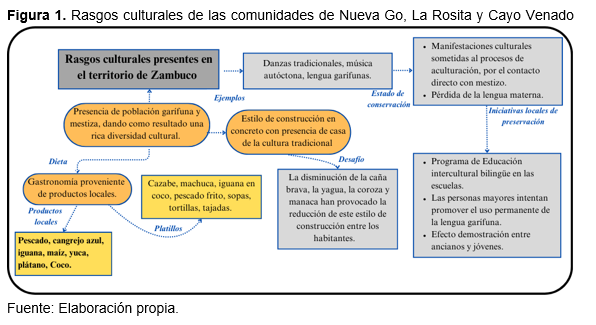De acuerdo con los resultados obtenidos del grupo focal se identifica que Zambuco es un territorio biocultural, donde se da una relación recíproca entre la cultura y la naturaleza. En este lugar se encuentran recursos biológicos, tradiciones, prácticas y conocimientos ancestrales de cada una de las tres comunidades. En cuanto a la cultura el territorio evidencia una gran diversidad cultural, pues la presencia de comunidades garífunas y mestizas en Zambuco enriquecen el paisaje cultural de la región. Esta mezcla entre mestizos y garífunas da lugar a una variedad de tradiciones y prácticas que reflejan la historia y la identidad local. La alimentación en la zona se basa en productos locales y de su tradición como pescado, cangrejo azul, iguana, maíz, yuca, plátano y coco, de los que se obtienen platillos típicos como el cazabe, machuca y pescado frito, estas muestras mantienen viva las tradiciones y cultura.
