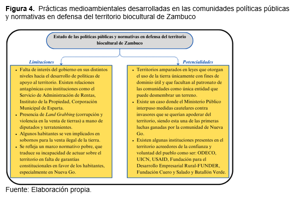 Los resultados sobre las políticas públicas y las normativas en defensa del territorio biocultural de Zambuco revelan una situación compleja en cuanto a la protección de los derechos de la comunidad y la gestión del territorio. La falta de atención por parte de los distintos niveles de gobierno en el desarrollo de políticas de apoyo al territorio limita las oportunidades para mejorar la seguridad jurídica de los habitantes. Tal como señala Ibáñez (2020), esta desconexión entre las necesidades de la comunidad y las acciones de las instituciones públicas refleja un vacío en la implementación de políticas efectivas que protejan los derechos de propiedad.